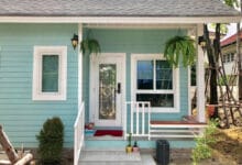 เสาหน้าบ้านตกแต่งล้อมรอบด้วยอิฐบล็อกสีน้ำตาลสลับสีครีม บริเวณเสาถูกติดตั้งโคมไฟเพิ่มเติม เพื่อความสวยงามหน้าบ้านมีระเบียงขนาดกว้าง เหมาะสำหรับทำเป็นโซนนั่งเล่นแบบเอาดอร์ พร้อมราวกั้น ภายนอกบ้านเลือกตกแต่งด้วยโทนสีเทา บันไดทางขึ้นบ้านนั้นอยู่ทางด้านข้าง