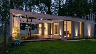 ลักษณะของบ้านชั้นเดียว ผนังด้านนอกตกแต่งด้วยสีขาว โดดเด่นด้วยฐาน หลังคาทรงจั่วไม่เหมือนใคร พื้นที่ระเบียงมีระแนงโลหะเป็นองค์ประกอบเสริมเพิ่มเติม พร้อมกับการเลือกปิดพื้นผิวภายนอกด้วยไม้ ที่ช่วยเพิ่มกลิ่นอายธรรมชาติให้กับบ้านหลังนี้ ทำให้ดูแล้วมีบรรยากาศที่สวยงามอย่างมาก